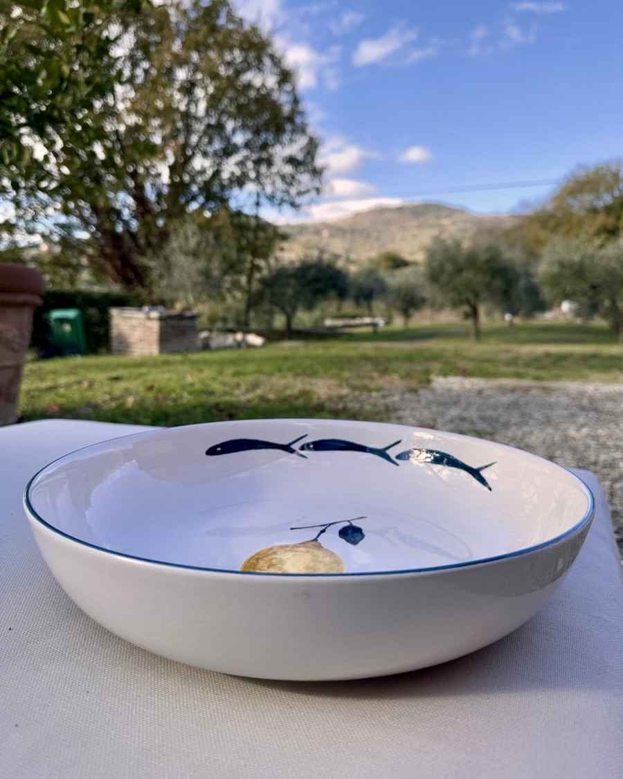 Crafted in Umbria, in collaboration with historic Italian ceramic workshops, each piece is handmade and hand-painted, embracing the subtle imperfections of the human touch. The collection is inspired by the forgotten stories of Mediterranean fisherwomen and by the quiet rituals of everyday life, meals shared, tables set and reset, objects passed from hand to hand.
