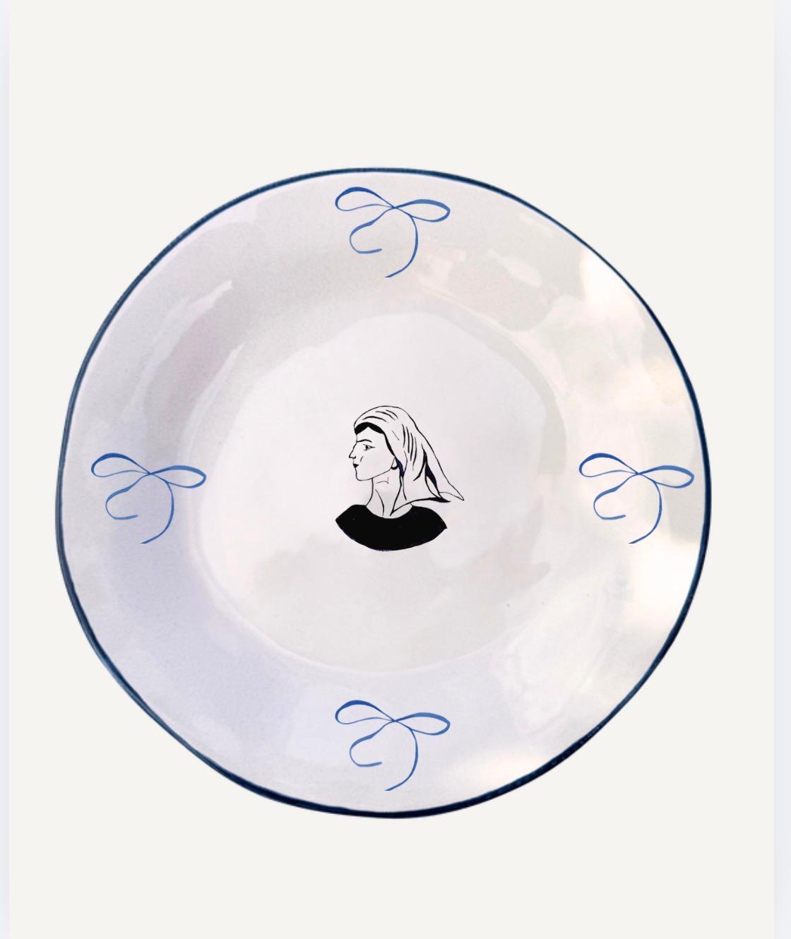 Around her, hand-printed symbols such as light blue bows/nastri azzurri here, will vary from plate to plate, making each piece unique. Subtle variations in print and tone are part of the craftsmanship, giving every plate its own character and story.