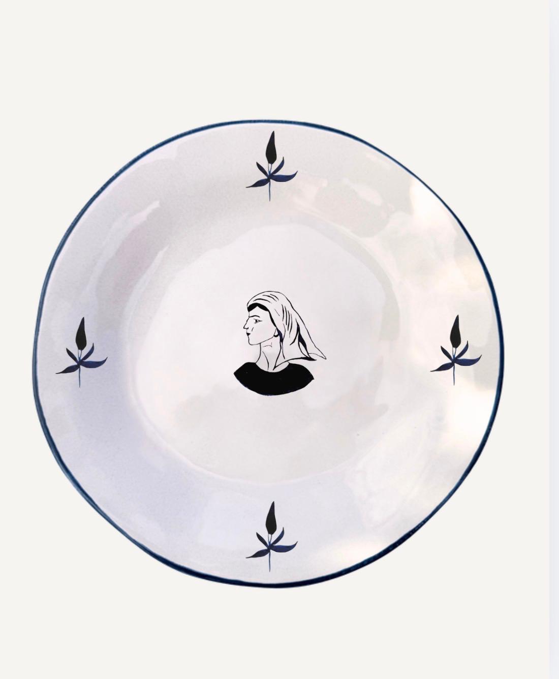Each plate in the La Pescatrice collection features the portrait of a fisherwoman at its center, printed in a deep, inky blue — a quiet, powerful presence that anchors the table.