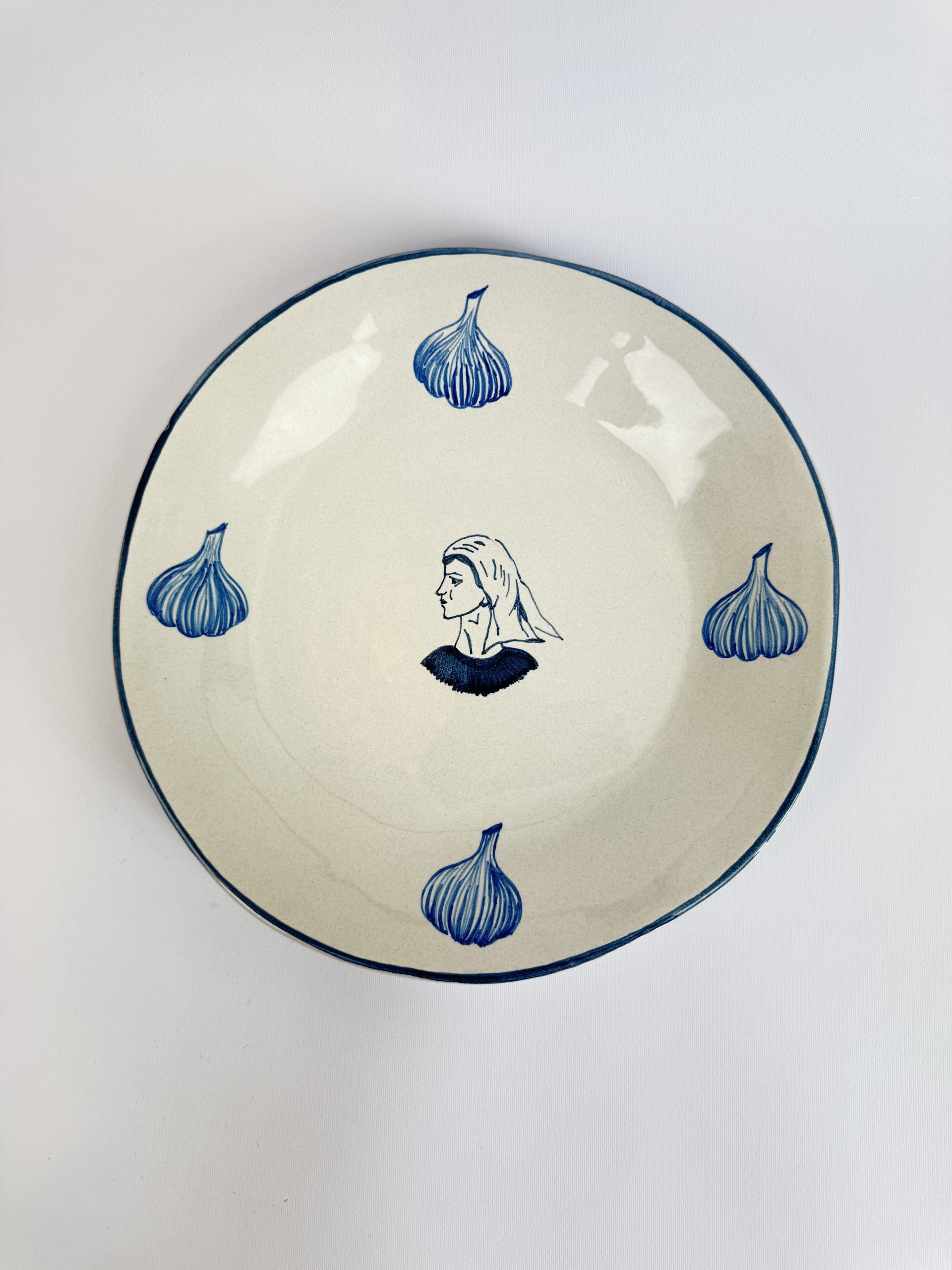 Inspired by the women of the Aeolian Islands, each plate in the La Pescatrice collection features the portrait of a fisherwoman at its center, painted by hand in a deep inky blue, set against an antique off-white glaze and a gently irregular form, it carries the marks of the hand and gives a quiet, powerful presence that anchors the table.
