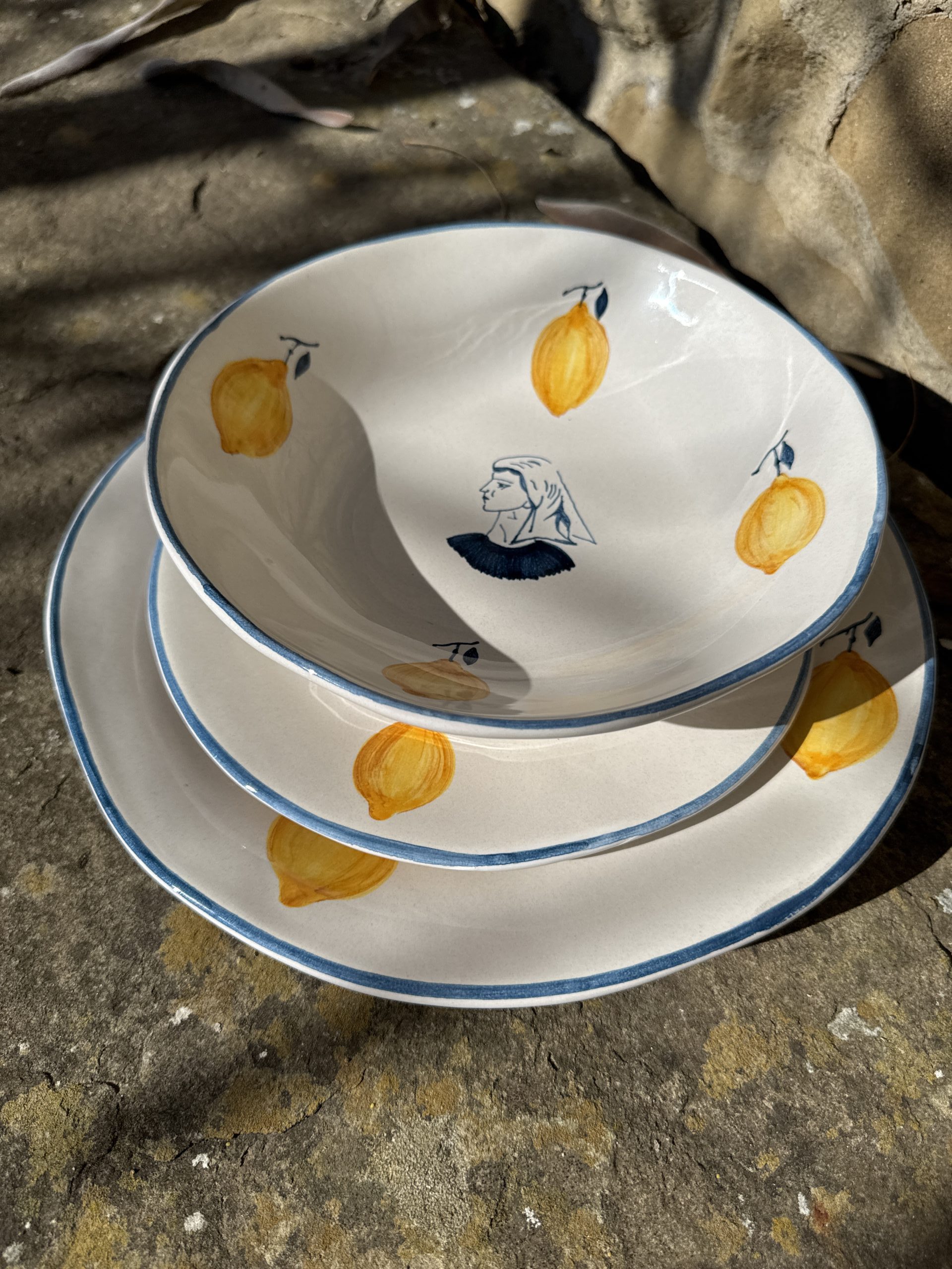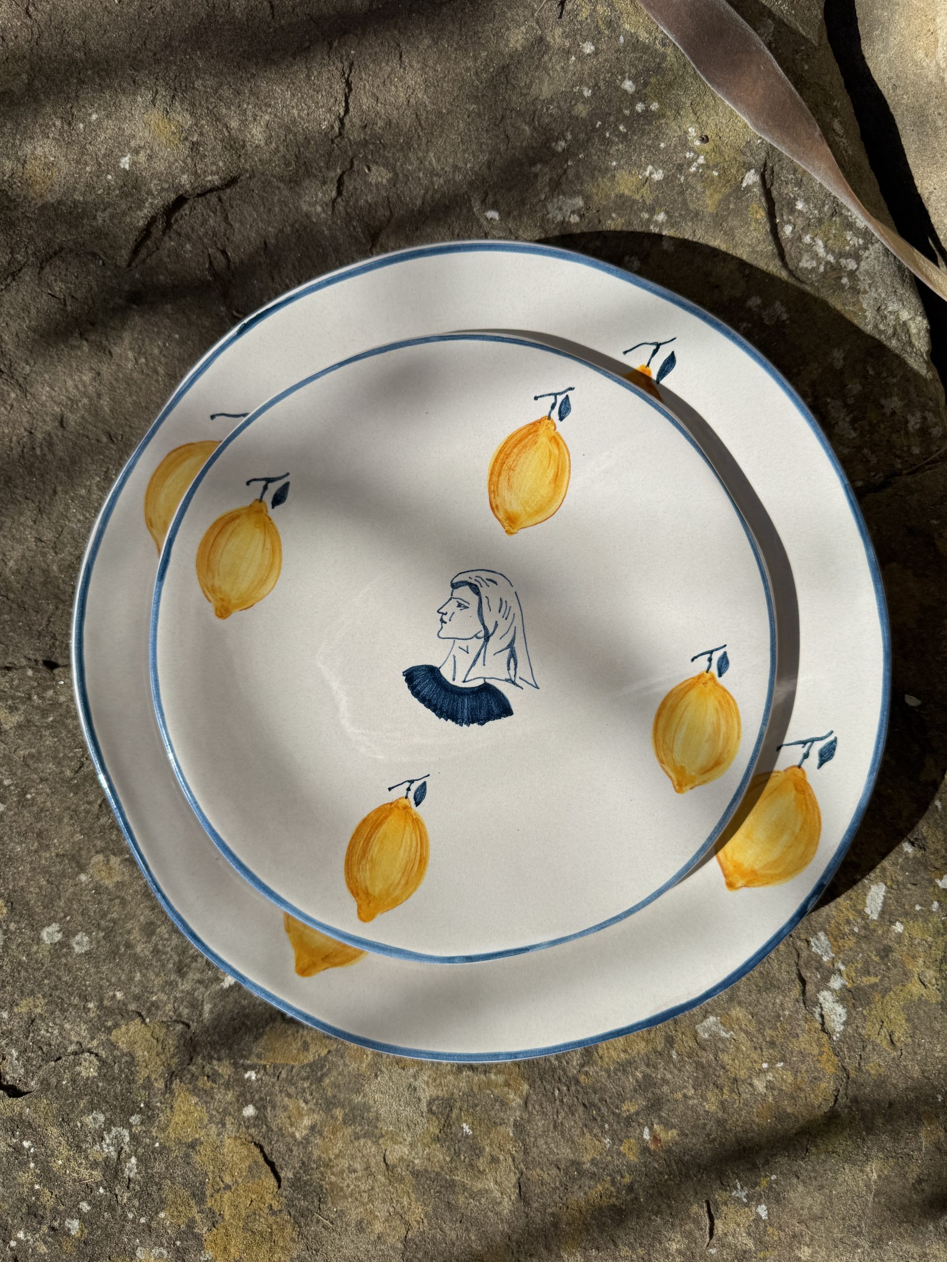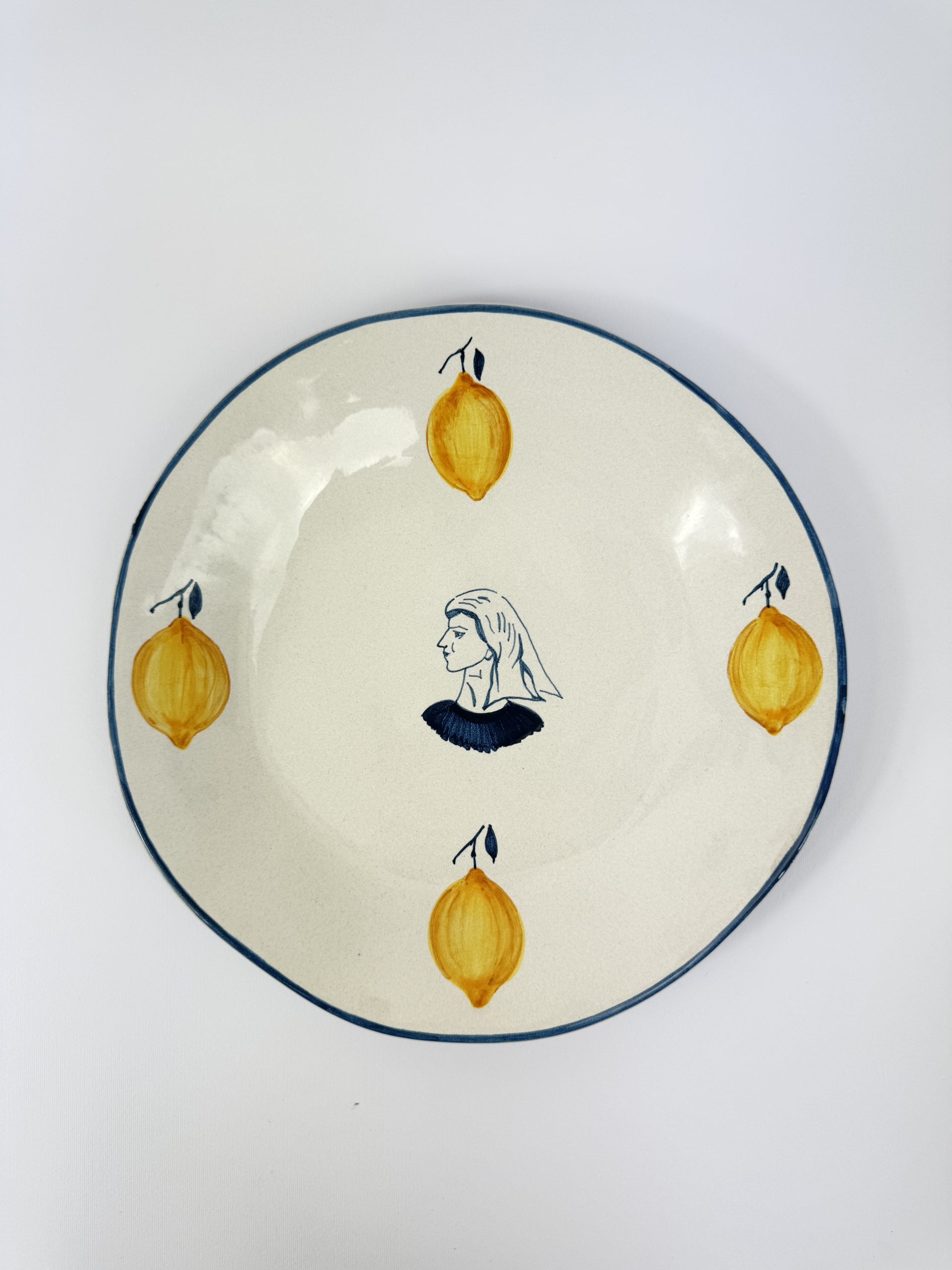 Inspired by the women of the Aeolian Islands, each plate in the La Pescatrice collection features the portrait of a fisherwoman at its center, painted by hand in a deep inky blue, set against an antique off-white glaze and a gently irregular form, it carries the marks of the hand and gives a quiet, powerful presence that anchors the table.