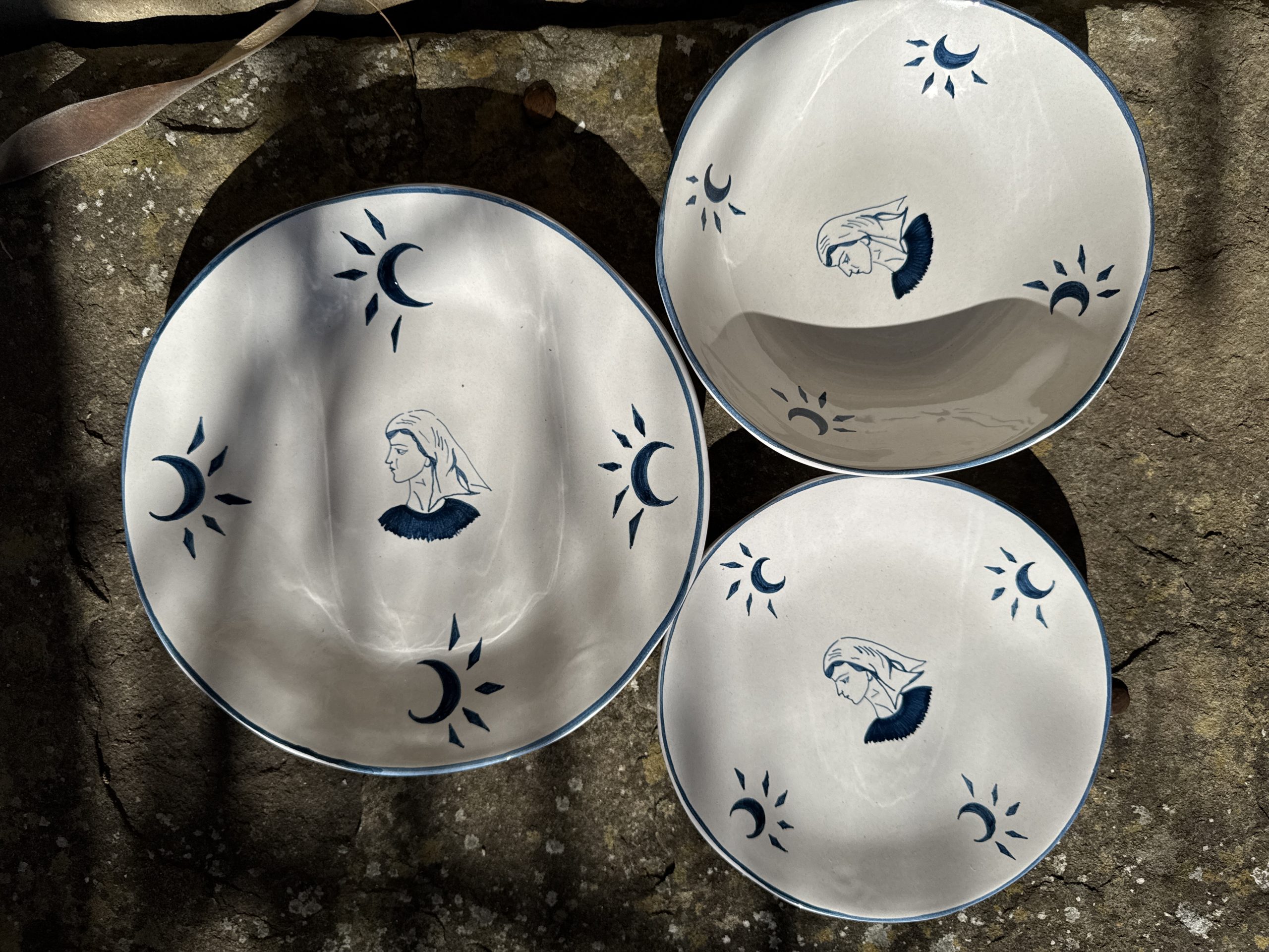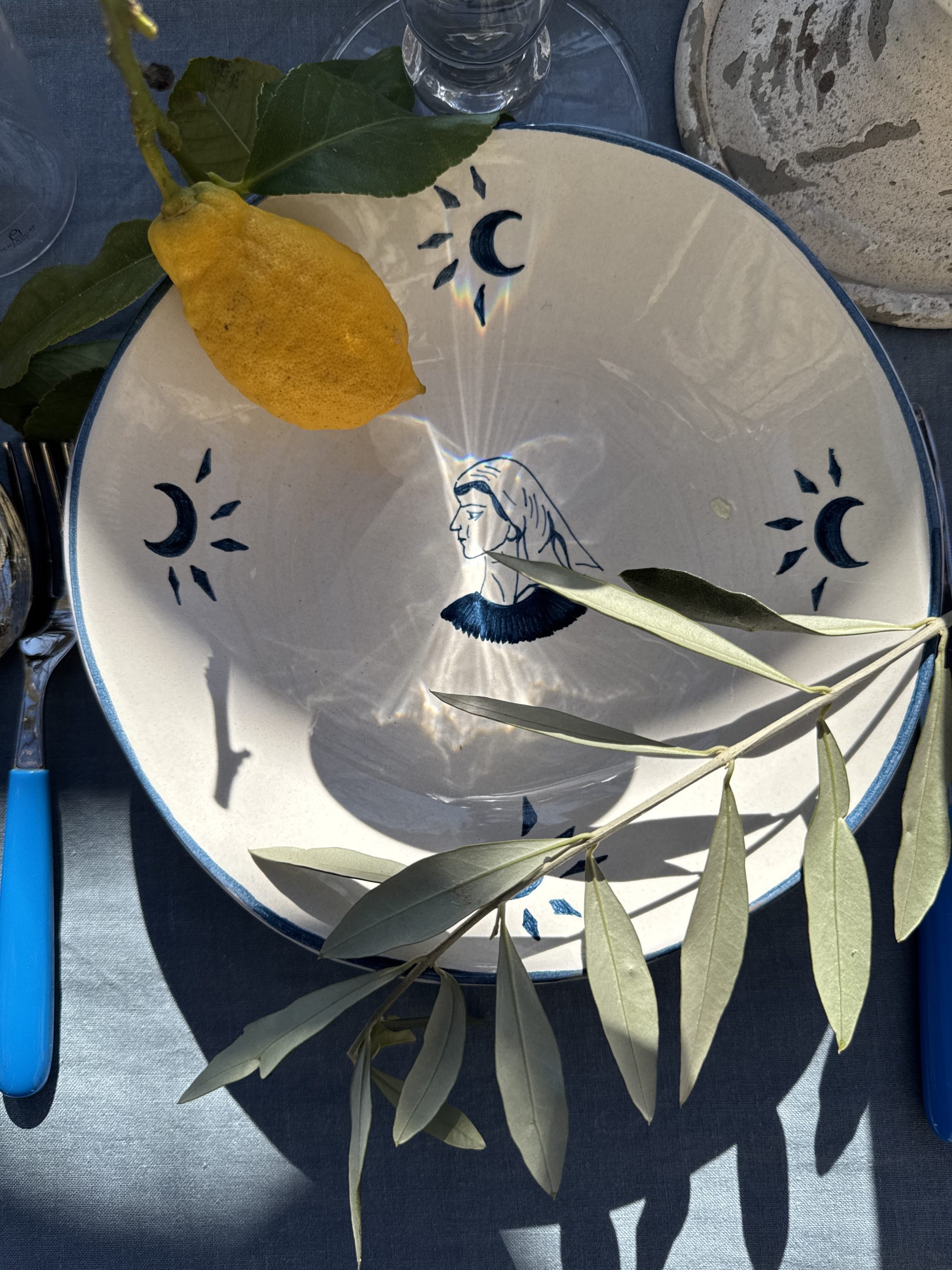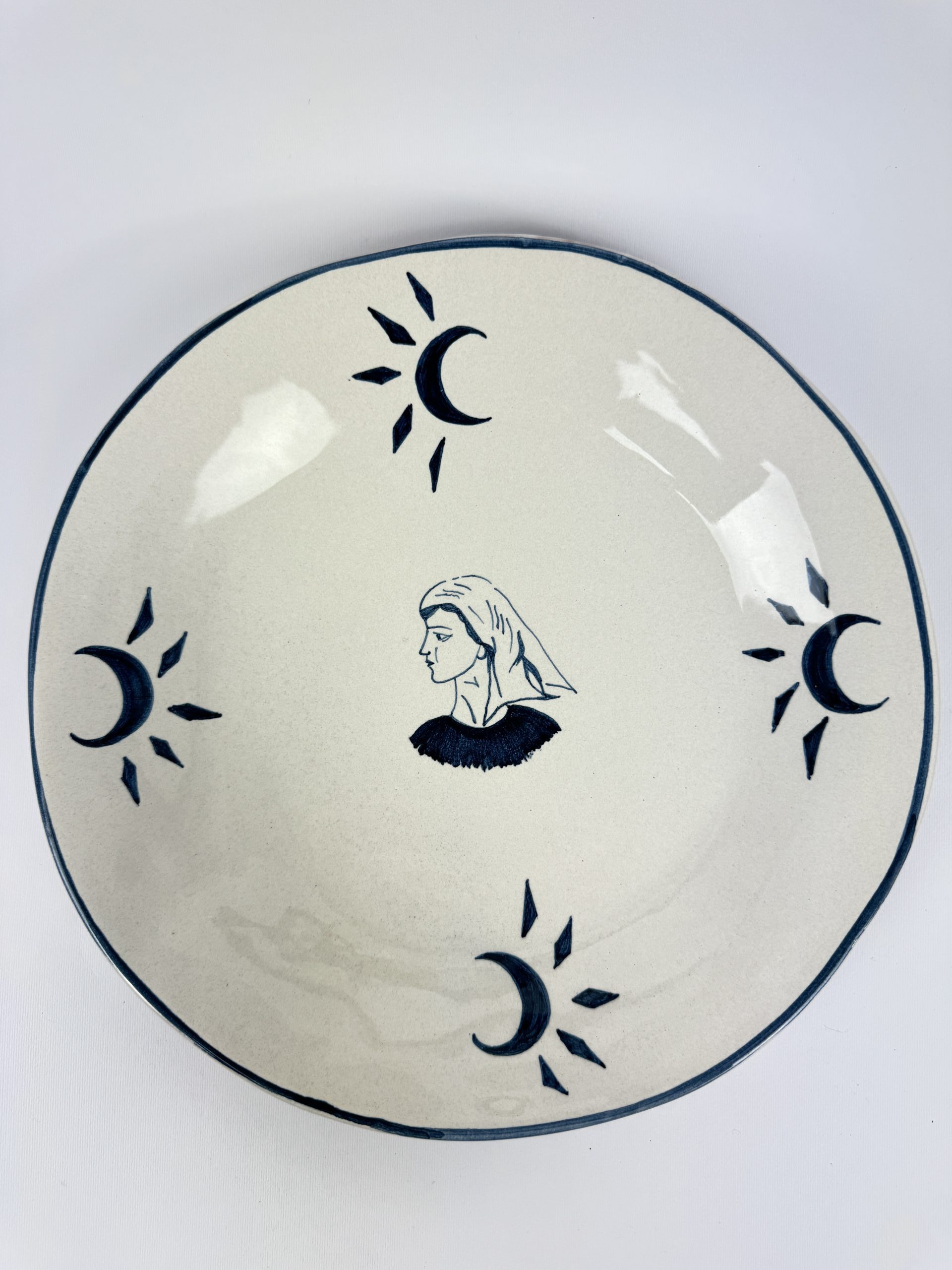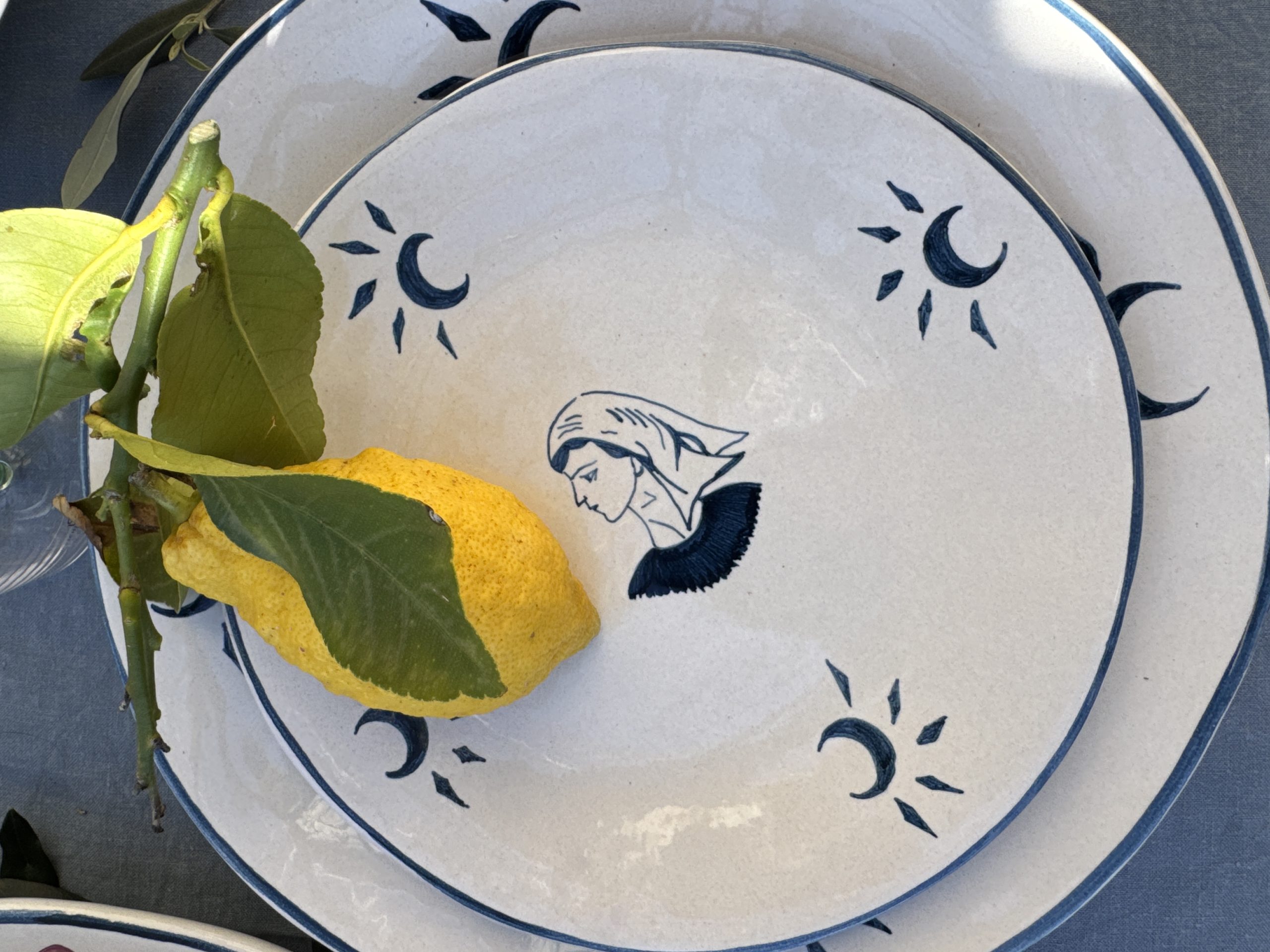 Inspired by the women of the Aeolian Islands, each plate in the La Pescatrice collection features the portrait of a fisherwoman at its center, painted by hand in a deep inky blue, set against an antique off-white glaze and a gently irregular form, it carries the marks of the hand and gives a quiet, powerful presence that anchors the table.