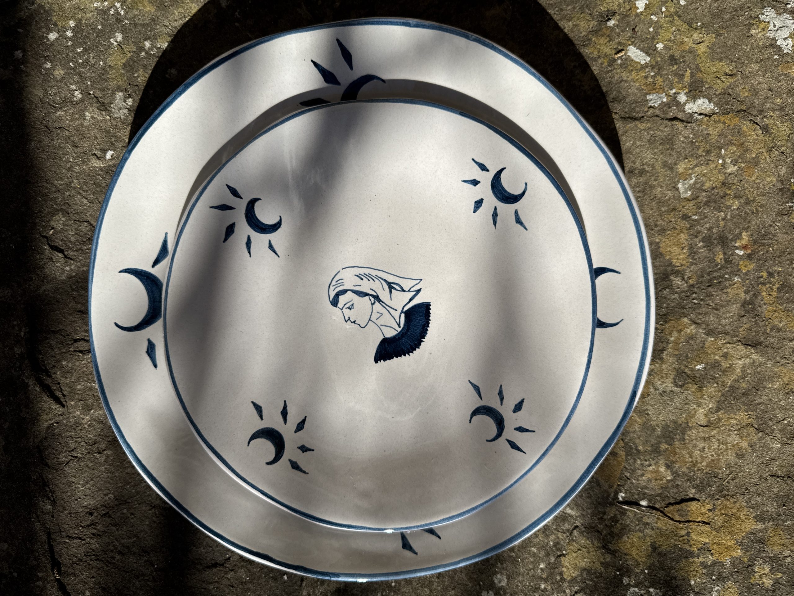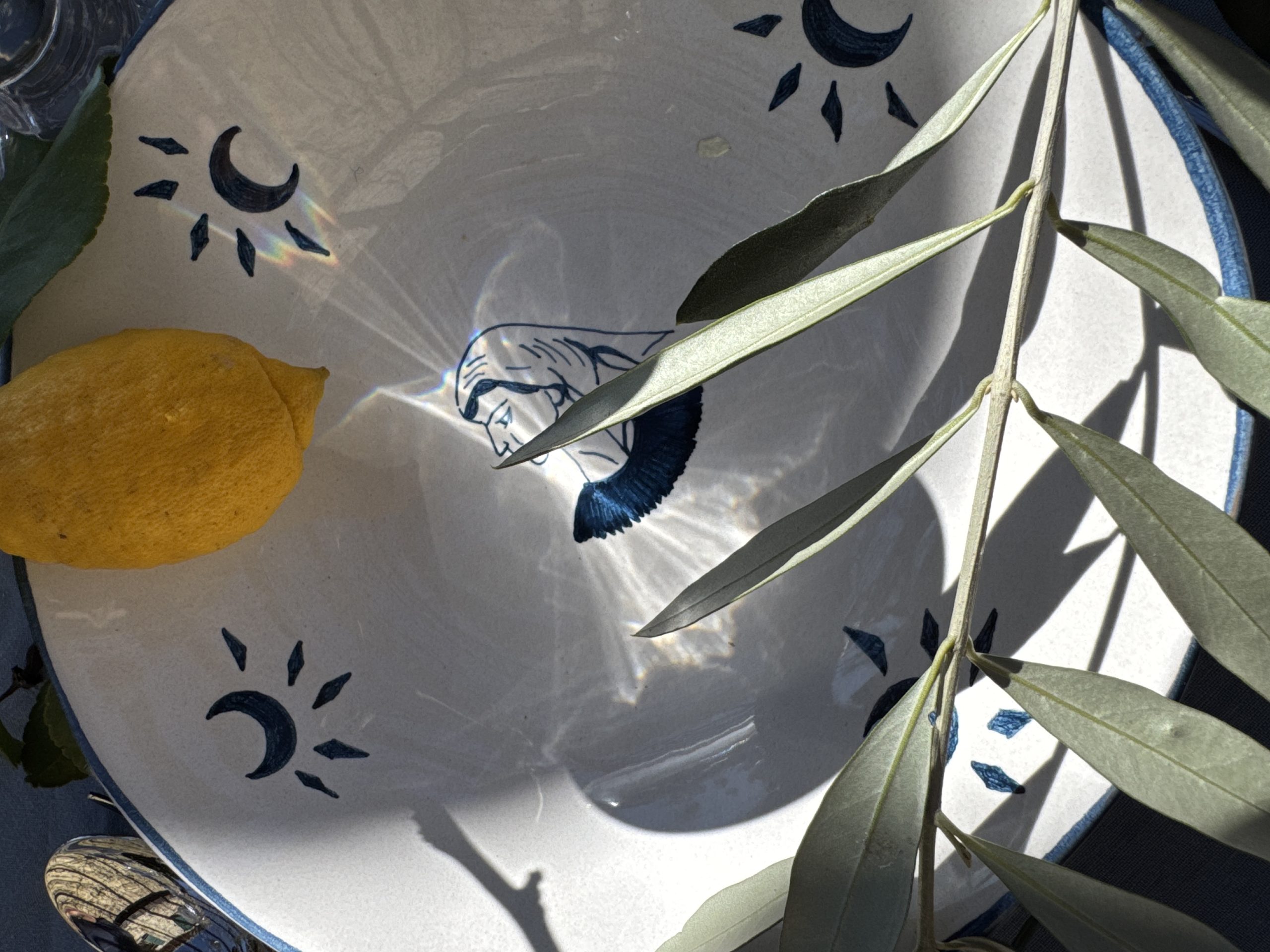 On this plate symbols such as the moon create a poetic Mediterranean composition.