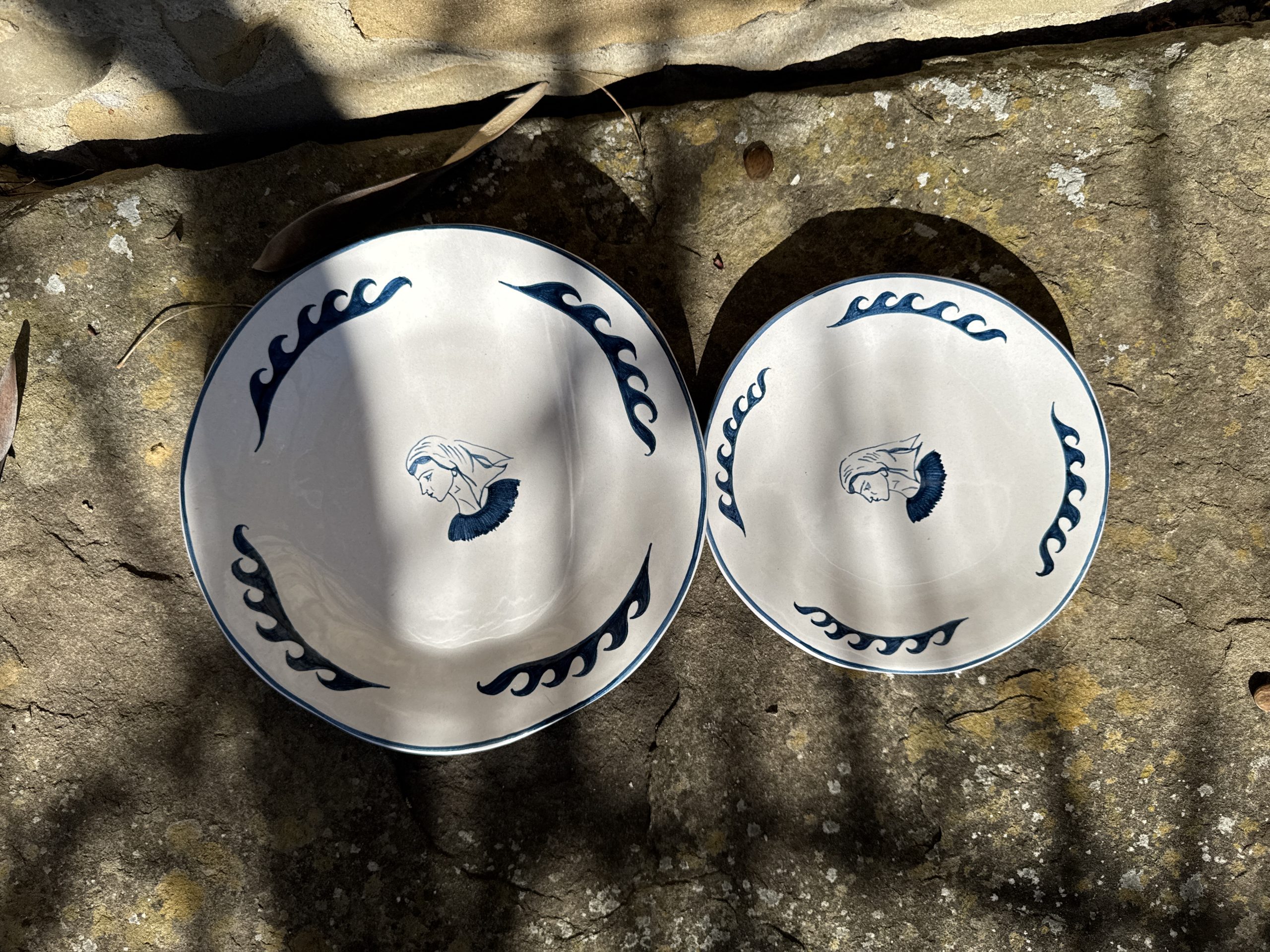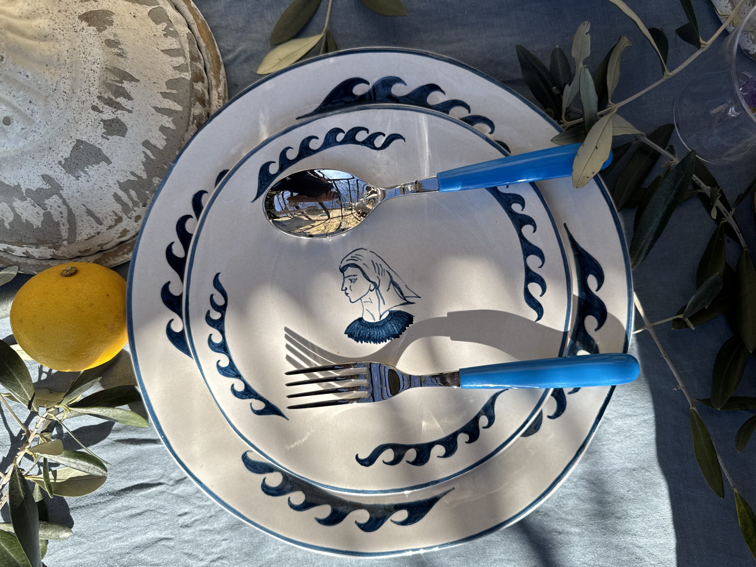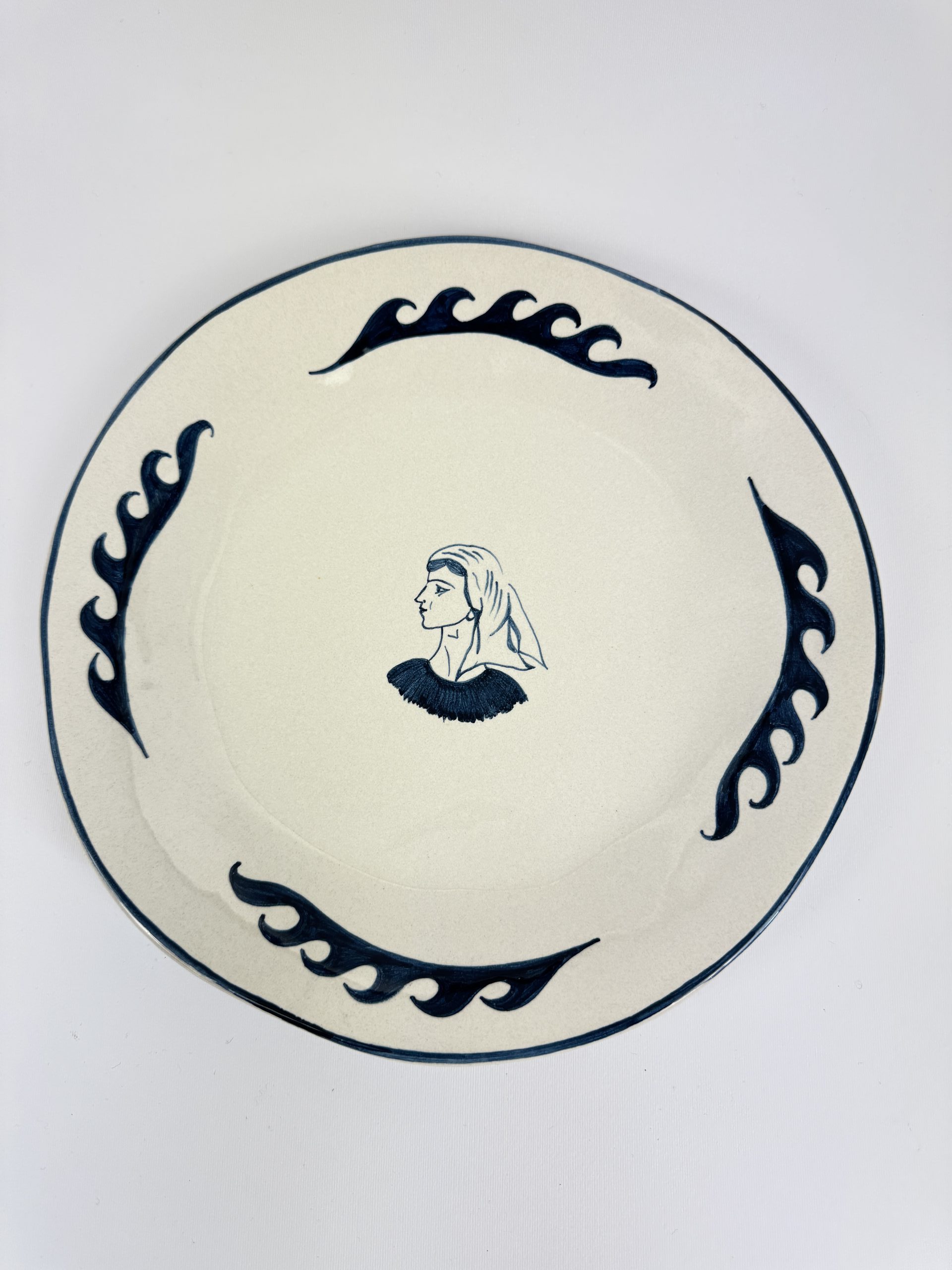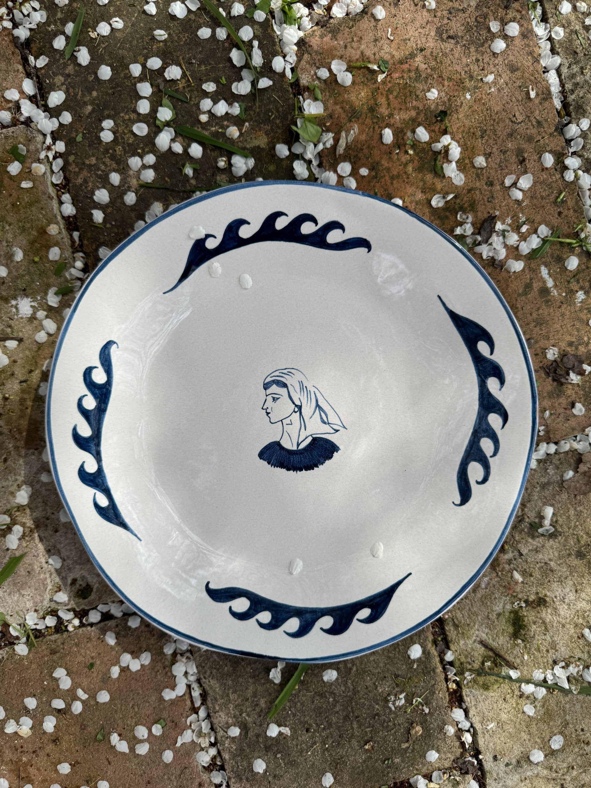 Inspired by the women of the Aeolian Islands, each plate in the La Pescatrice collection features the portrait of a fisherwoman at its center, painted by hand in a deep inky blue, set against an antique off-white glaze and a gently irregular form, it carries the marks of the hand and gives a quiet, powerful presence that anchors the table.
