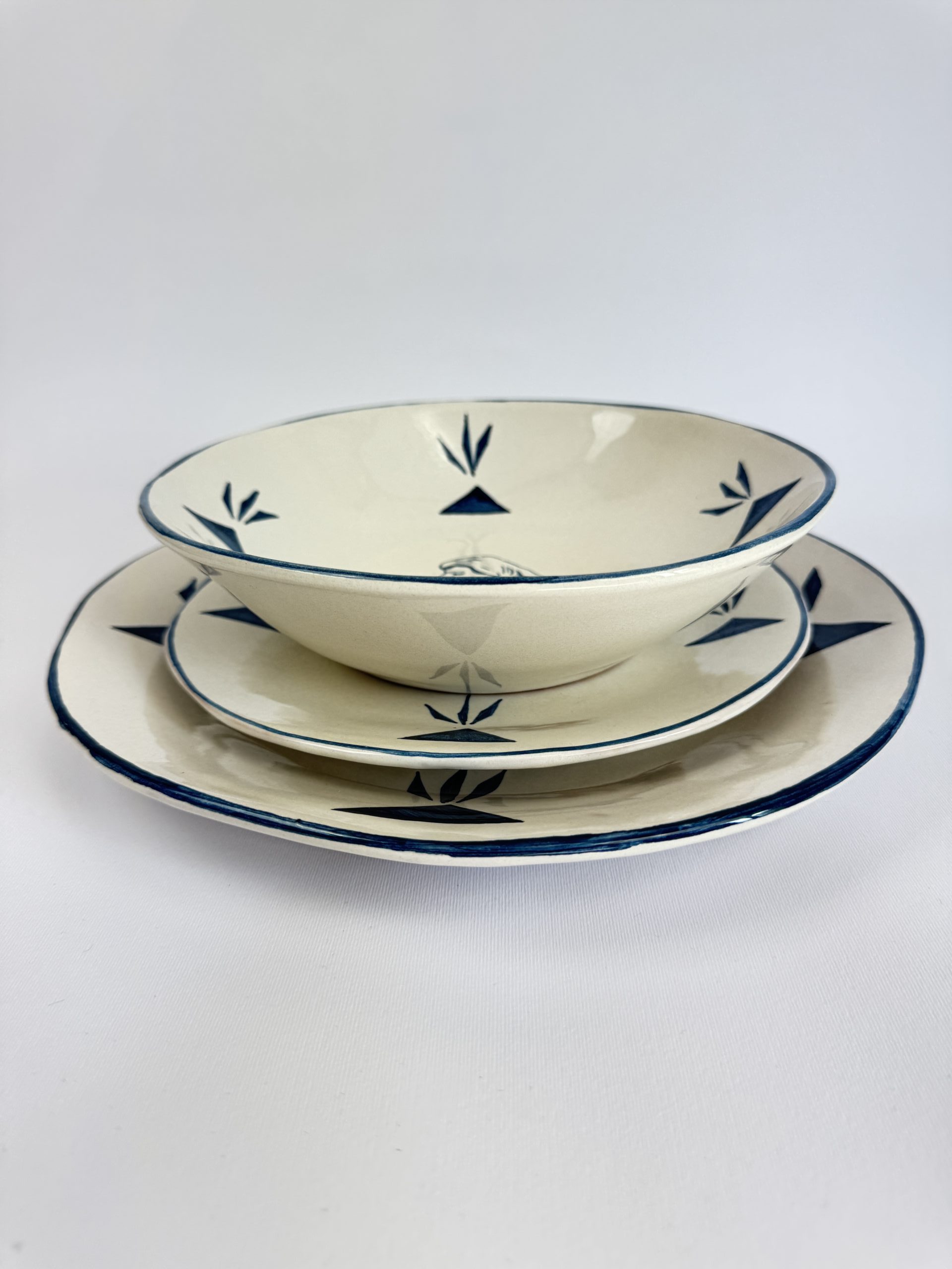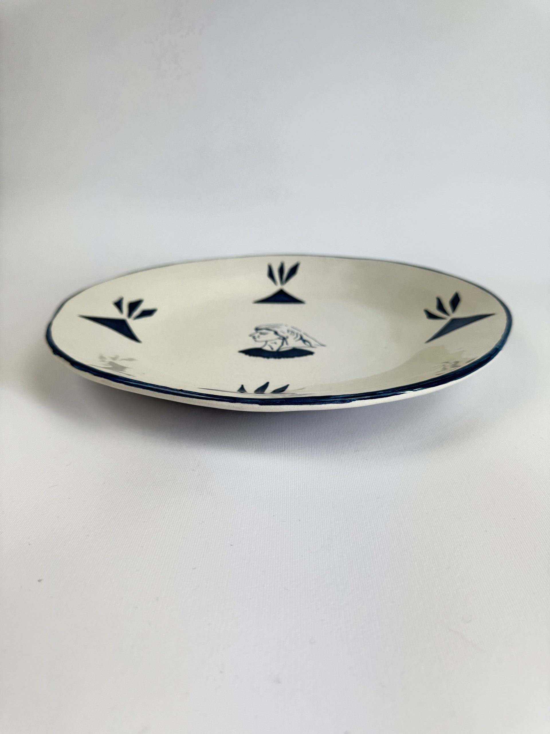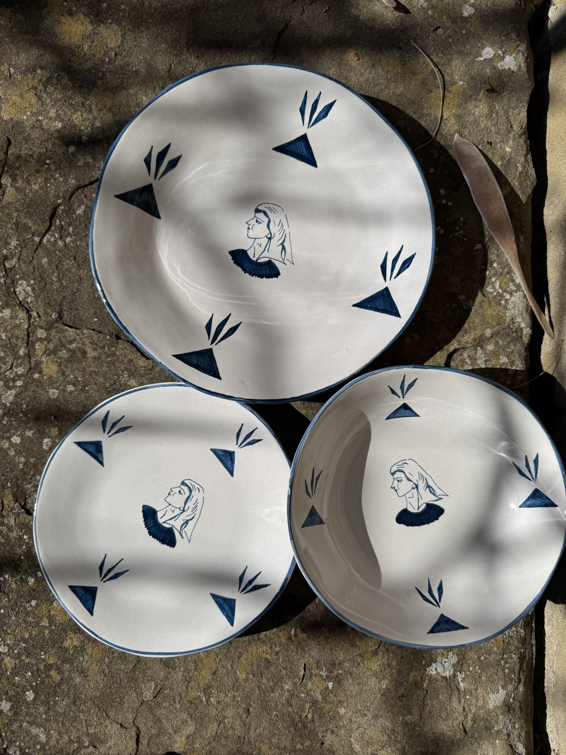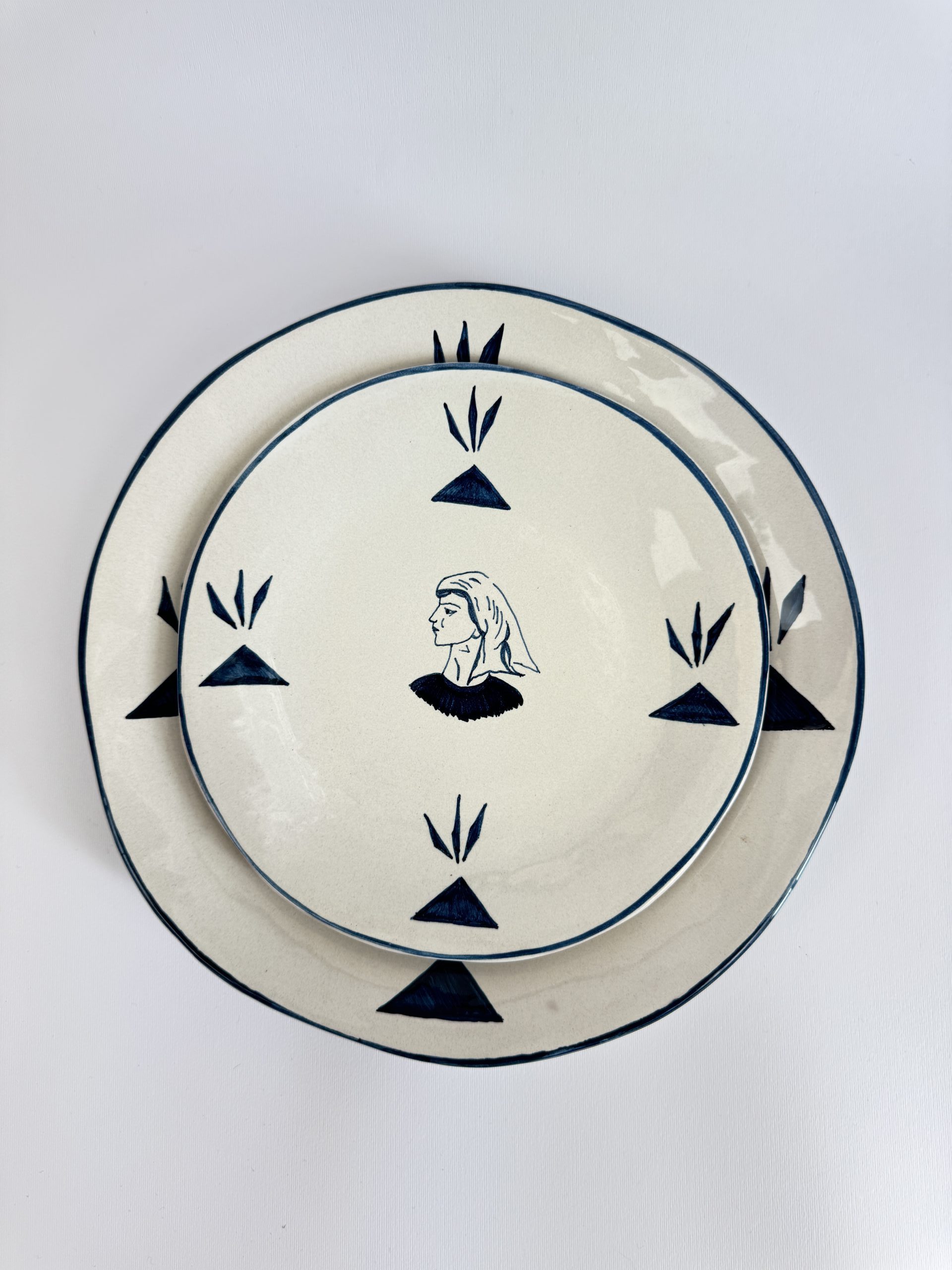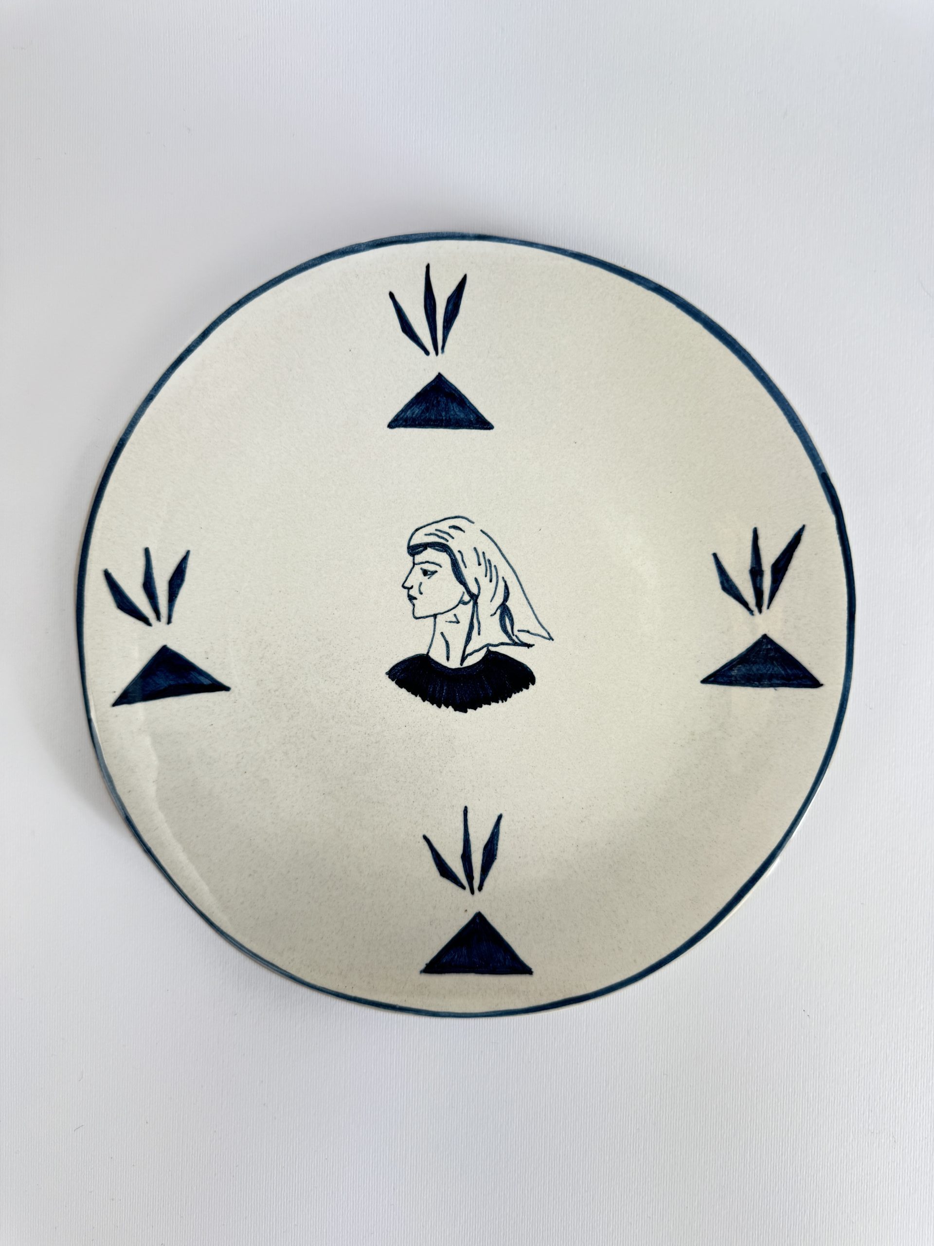 Inspired by the women of the Aeolian Islands, each plate in the La Pescatrice collection features the portrait of a fisherwoman at its center, painted by hand in a deep inky blue, set against an antique off-white glaze and a gently irregular form, it carries the marks of the hand and gives a quiet, powerful presence that anchors the table.